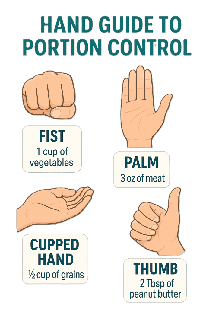• A simple way to make sure you are getting the right portions is to use your hands as measurements – check out the graphic here that explains this.